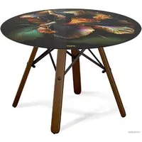 журнальный столик, 600x600 мм, высота 446 мм, материал: стекло (столешница), окрашенная сталь/МДФ (опоры), рисунок. Возможны дополнительные скидки : при заказе комплекта из нескольких наименований, при повторной покупке в нашем магазине